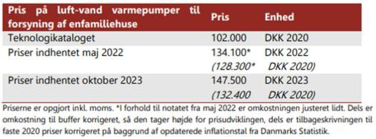 I efteråret 2023 fik Dansk Fjernvarme EA Energianalyse til at opdatere deres prisunder- søgelse. Det viste sig her, at prisen på en varmepumpe var steget med knap 50 pct. i løbende priser og derved med 20 pct. mere end den generelle inflation i samme periode.