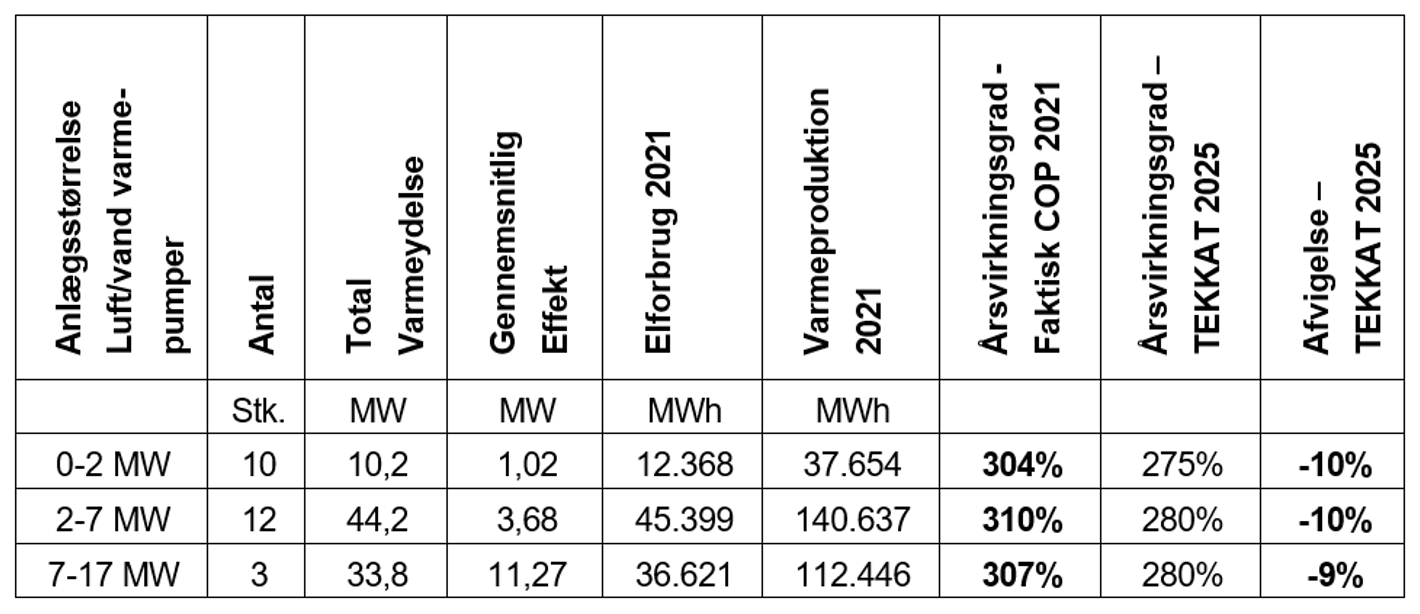 De faktisk opnåede årsvirkningsgrader (COP-faktorer) for anlæggene etableret frem til 2021 ligger ca. 10% over den foreslåede værdi for 1, 3 og 10 MW anlæg i høringsversionen af teknologikataloget.