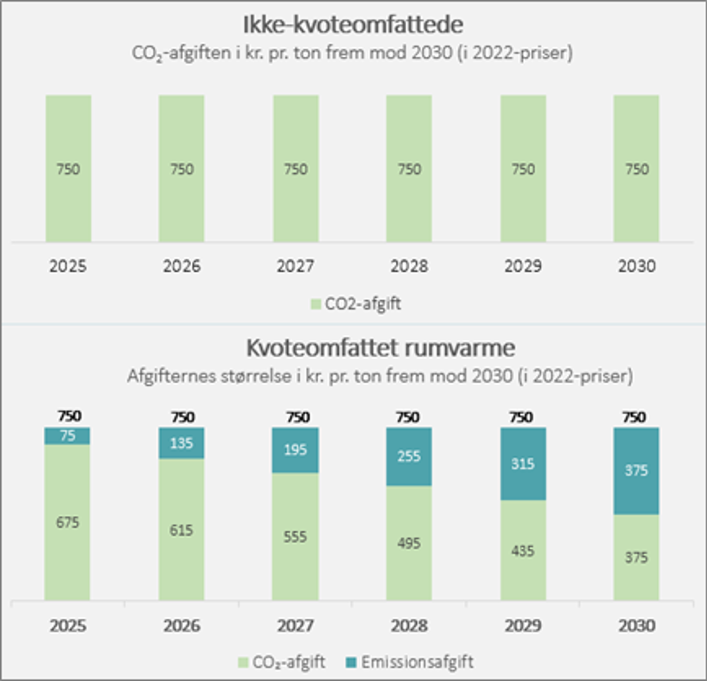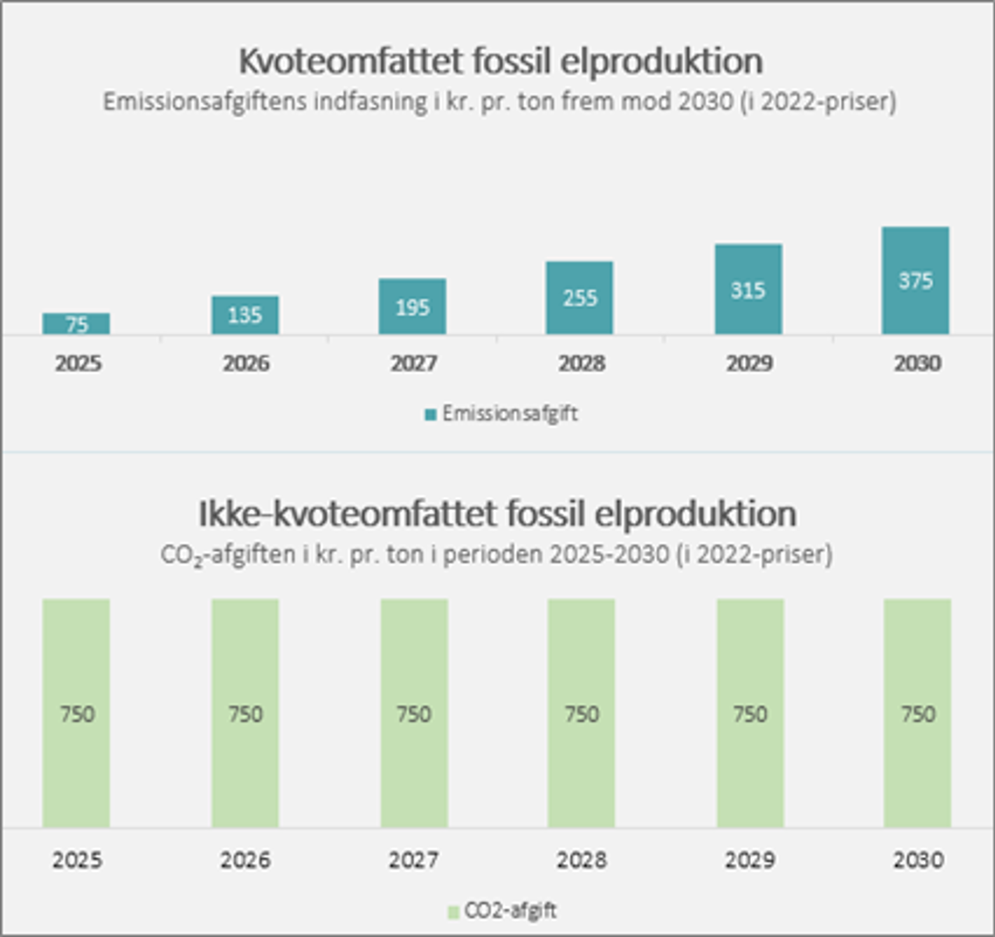 Derudover hæves CO2-afgiften på fossil elproduktion for ikke-kvoteomfattede selskaber til 750 kr. pr. ton CO2 (2022-priser), mens der gradvist indføres en ny CO2-afgift på 375 kr. (2022-priser) pr. ton CO2 på fossil elproduktion for de kvoteomfattede selskaber i vores sektor.