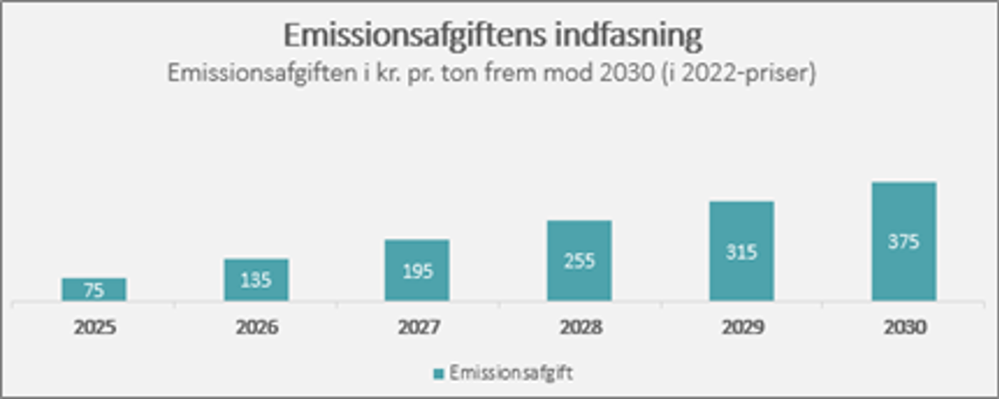 Emissionsafgiften indfases gradvist frem mod 2030, jf. figur 1 nedenfor. Heraf fremgår også satserne i indfasningsperioden 2025-2030 (i 2022-priser). De viste satser vil som nævnt ovenfor blive pristalsreguleret med udviklingen i nettoprisindekset. Emissionsafgiften lander i 2025 på 85,2 kr. pr. ton CO2 i 2025.