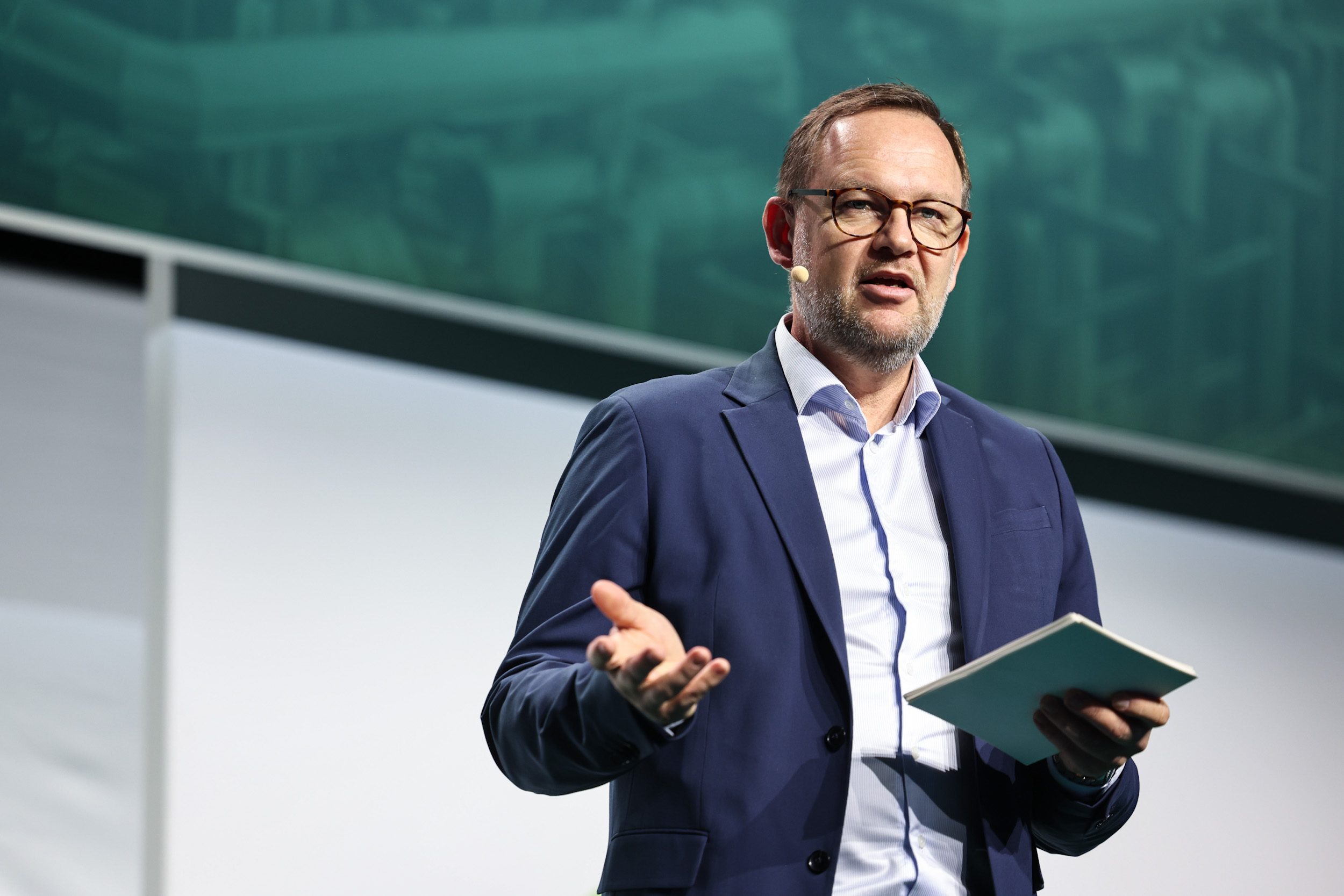 - Hvis man politisk beslutter sig for at sadle om, selvom jeg her advarer mod det, så skal det ikke komme forsyningsselskaberne eller vores forbrugere til last. Det kan ikke være forbrugerne og fjernvarmeselskaberne, der skal stå tilbage med regningen fordi regeringen og Folketinget zig-zagger, siger Jesper Frost Rasmussen i sin tale til Landsmøde 2025. Foto: Jesper Voldgaard.