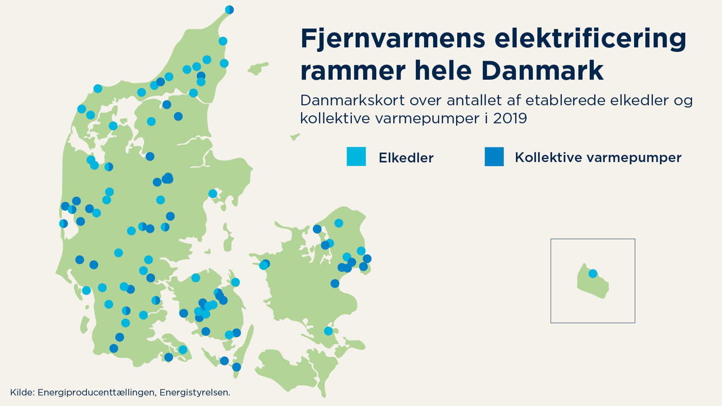 Siden 2019 er den elbaserede fjernvarme steget, og faktisk kan fjernvarmens elektrificering ses i hele Danmark, hvor der næsten står en varmepumpe eller elkedel i hver kommune.