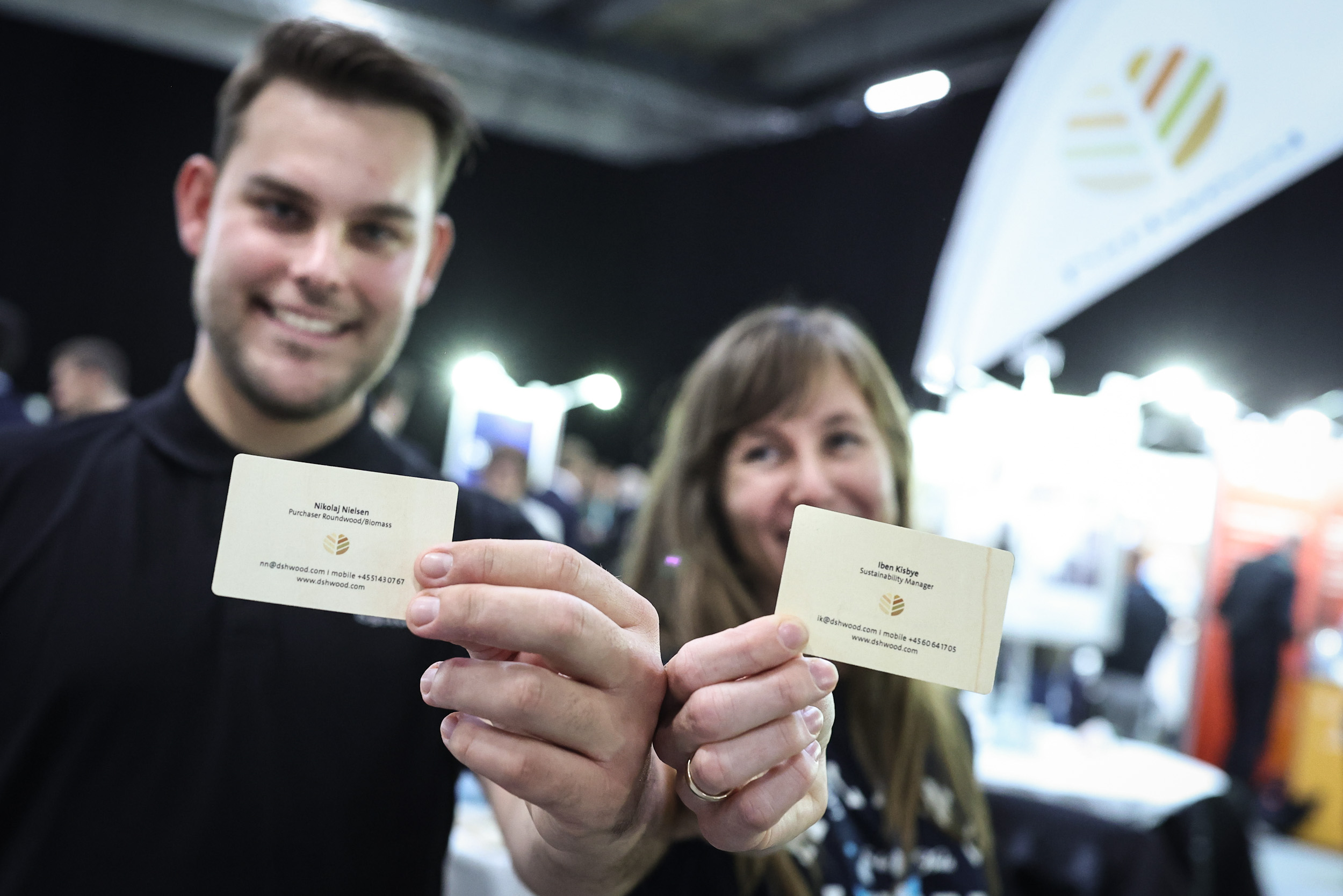 DSH Wood har deltaget i over femten år i Dansk Fjernvarmes Landsmøde, det er fjerde gange Nikolaj Nielsen (t.v.) deltager i landsmødet, og første gang at Iben Kisbye (t.h.) deltager i år. Foto: Jesper Voldgaard.