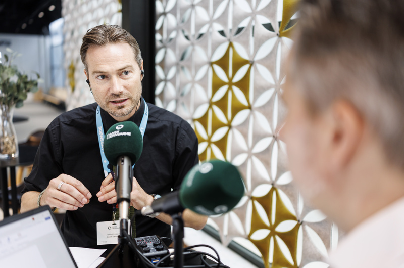 Mikkel Lysgaard optager tre gange til Dansk Fjernvarmes podcast under Landsmøde 2025 i Odense Congress Center. Du kan lytte med ved Dansk Fjernvarmes stand. Foto: Jesper Voldgaard.