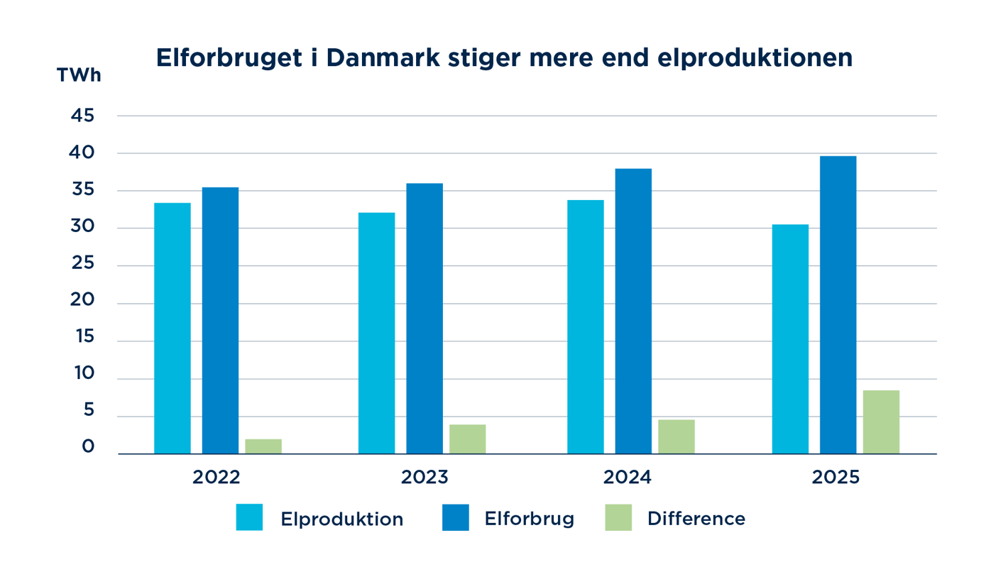 Elforsyningen i 2025 bestod af mere el fra udlandet end, det har gjort tidligere år. Strømmen kom fra Norge, Sverige og Holland, fordi det danske elforbrug stadig stiger hurtigere end elproduktionen, og det efterlader et usikkert vakuum i elforsyningssikkerheden.