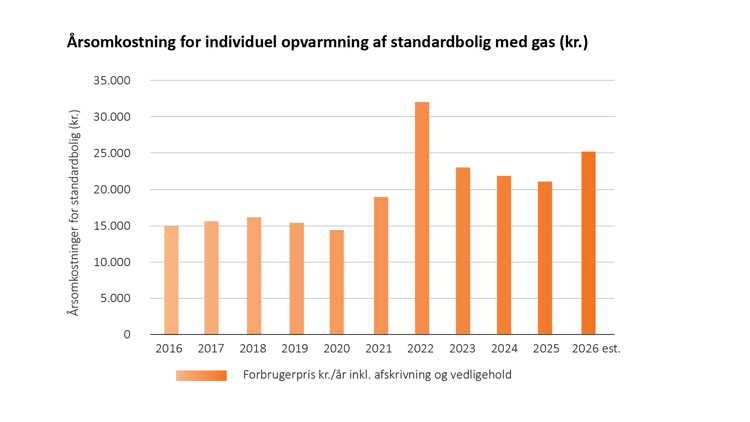 Siden 2020 har de årlige udgifter til varmeforsyning på gas været høje, hvor de i 2022 lå på over 30.000 kroner. Dansk Fjernvarmes beregninger viser, at opvarmning af en standardbolig med gas overstiger 25.000 kroner i 2026, hvis de nuværende gaspriser varer ved. Dette vil være en markant stigning sammenlignet med 2025, som var godt 20.000 kroner. Før energikrisen 2022 var omkostningsniveauet omtrent 15.000 kroner om året.